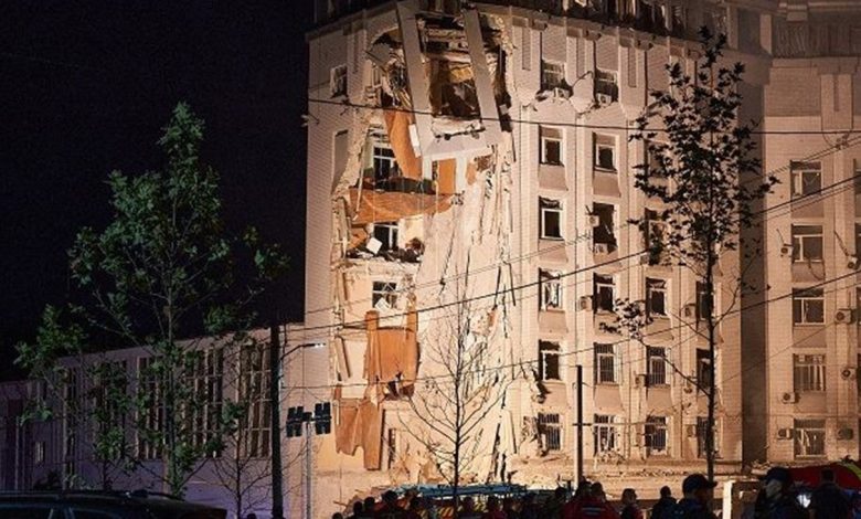 وأظهرت مقاطع فيديو نُشرت على مواقع التواصل الاجتماعي ووسائل إعلام أوكرانية الطوابق العلوية لمجمع سكني مدمّرة جزئياً، ويتصاعد منها الدخان بينما تناثر الركام في الساحة.
